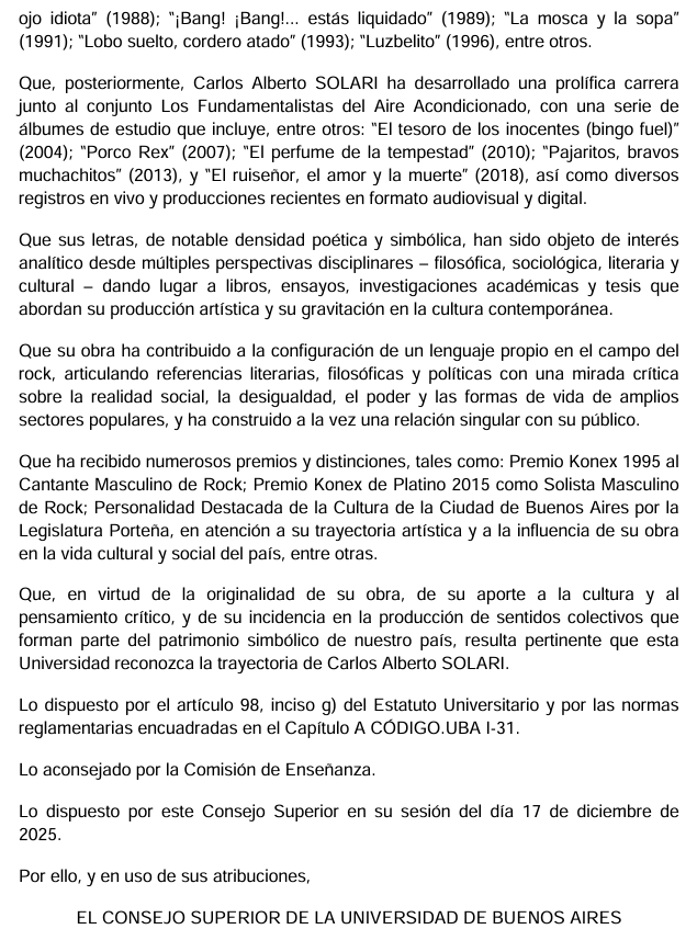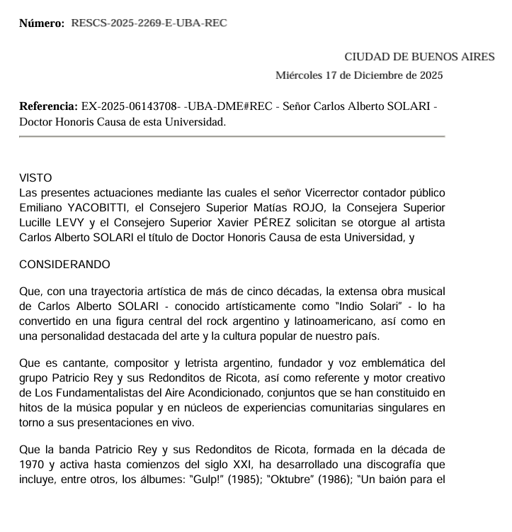 La Universidad de Buenos Aires (UBA) decidió otorgar su máxima distinción académica, el título de Doctor Honoris Causa, a Carlos Alberto «Indio» Solari. La resolución fue aprobada esta semana durante la última sesión del año del Consejo Superior, validando un pedido que busca reconocer el impacto del artista en la cultura popular argentina. La iniciativa fue impulsada por el vicerrector Emiliano Yacobitti junto a consejeros estudiantiles.