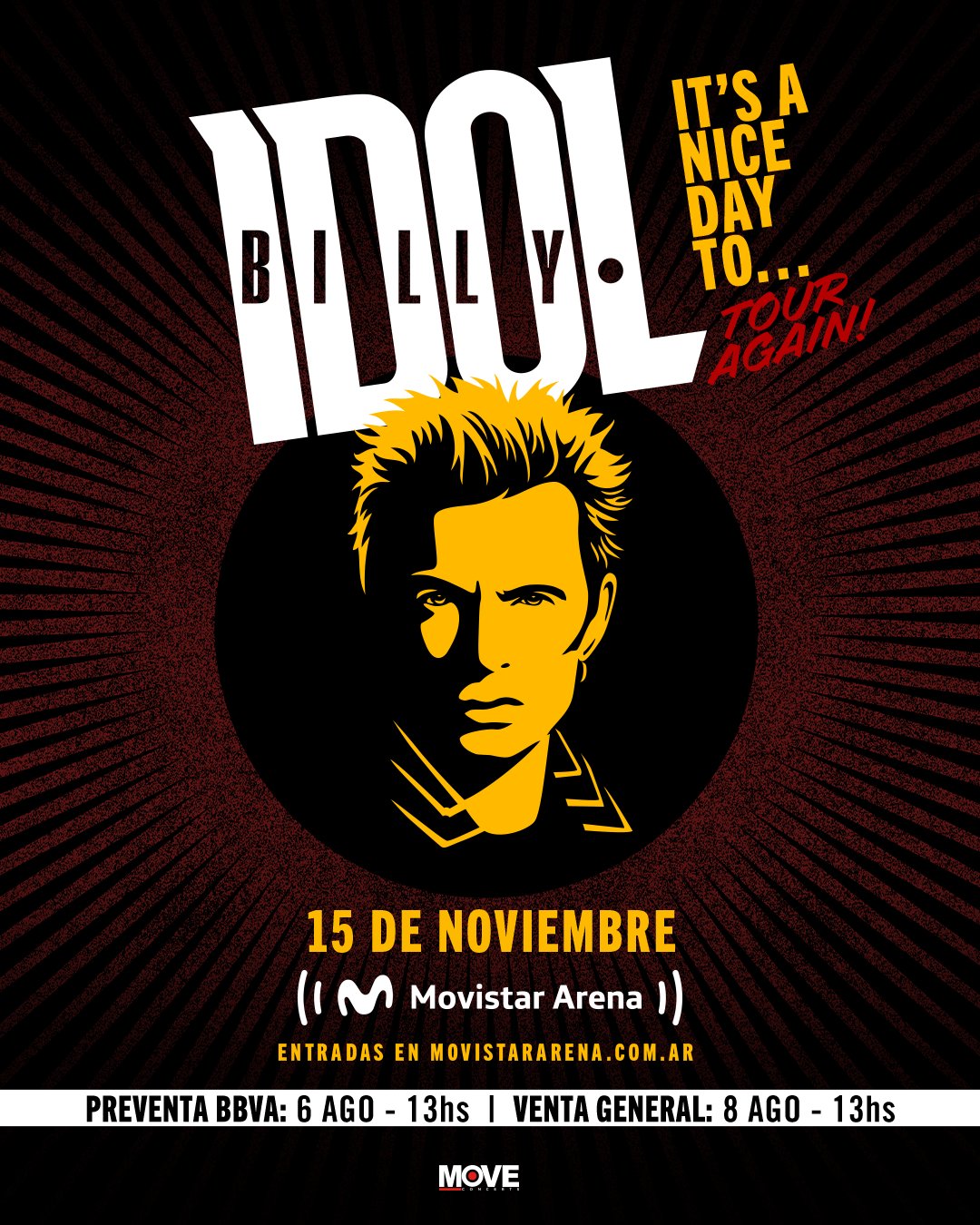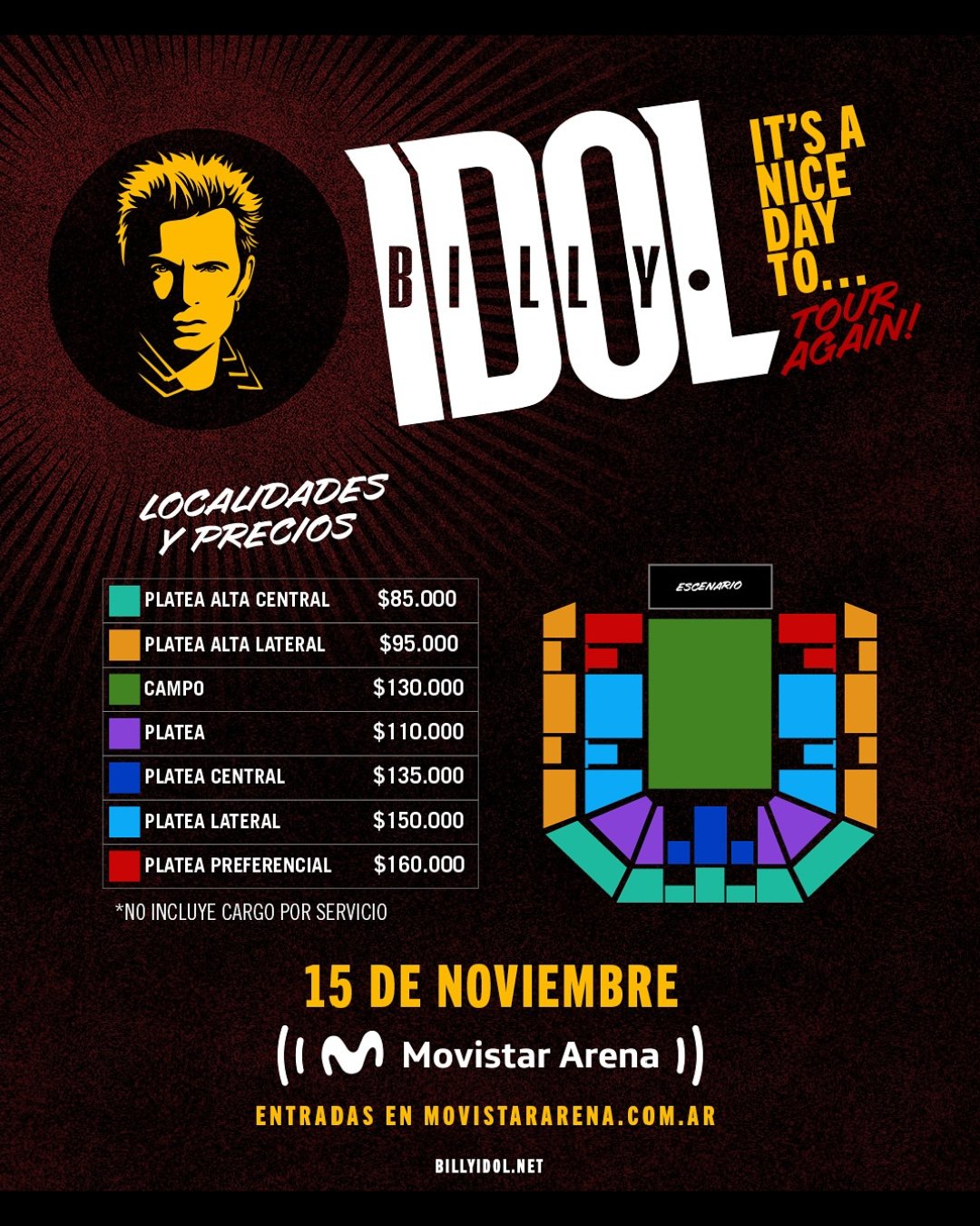 Las entradas para ver a Billy Idol en Argentina estarán a la venta exclusivamente a través de www.movistararena.com.ar. Se recomienda desde la organización del evento no comprar en sitios no oficiales para evitar estafas.