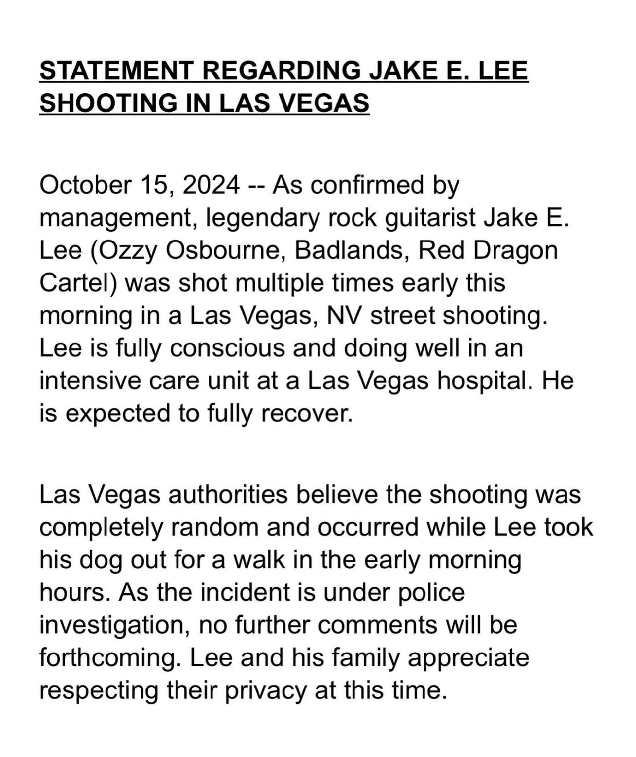 «Como confirmó la dirección, el legendario guitarrista de rock Jake E. Lee recibió varios disparos esta mañana temprano en un tiroteo callejero en Las Vegas», se lee en el comunicado. «Lee está completamente consciente y se encuentra bien en una unidad de cuidados intensivos en un hospital de Las Vegas. Se espera que se recupere por completo».