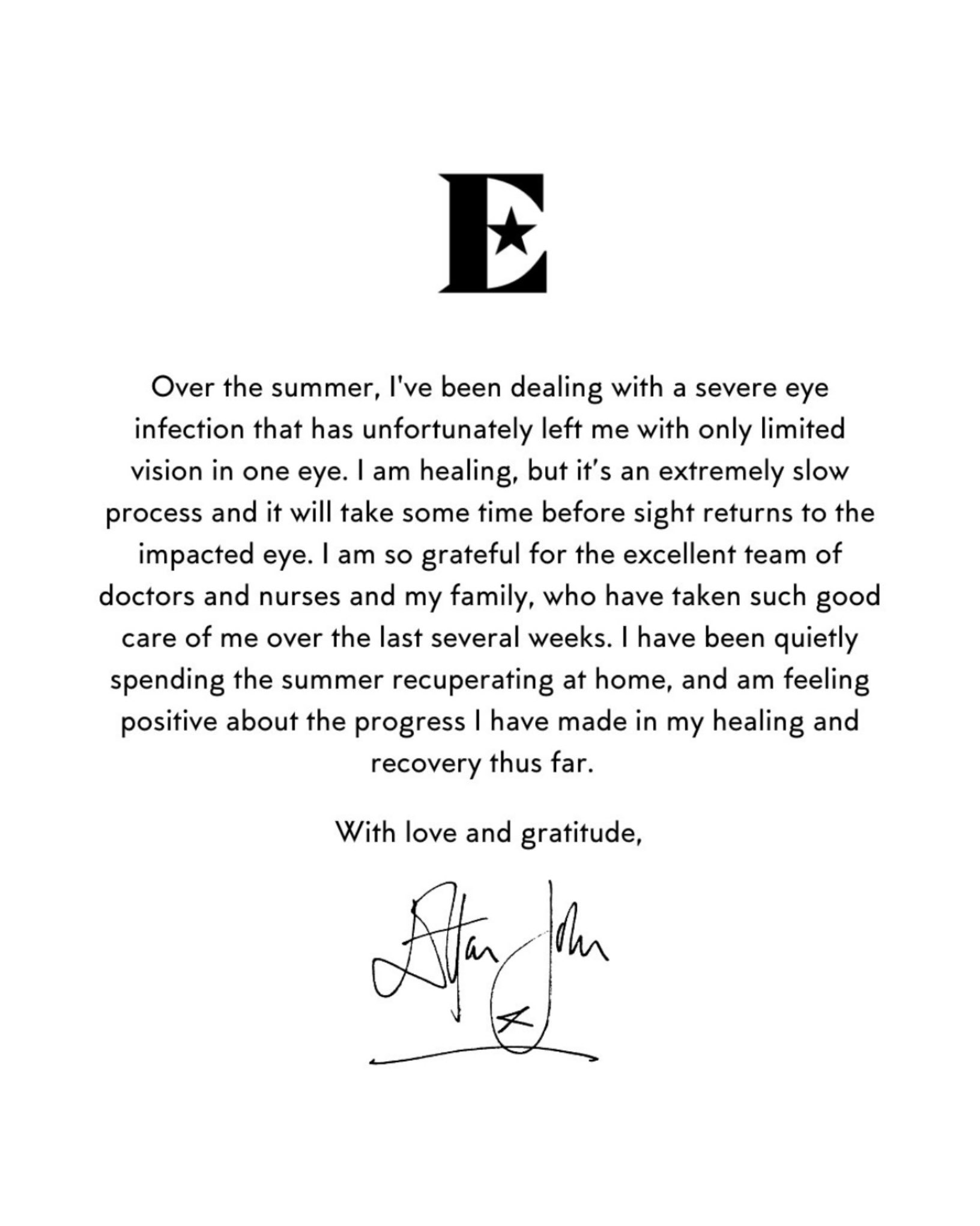 «Estoy muy agradecido con el excelente equipo de médicos y enfermeras y con mi familia, que me han cuidado tan bien durante las últimas semanas. Pasé el verano tranquilamente recuperándome en casa, y me siento positivo por los progresos que he hecho hasta ahora en mi curación y recuperación. Con amor y gratitud, Elton John», escribió a sus casí 5 millones de seguidores.