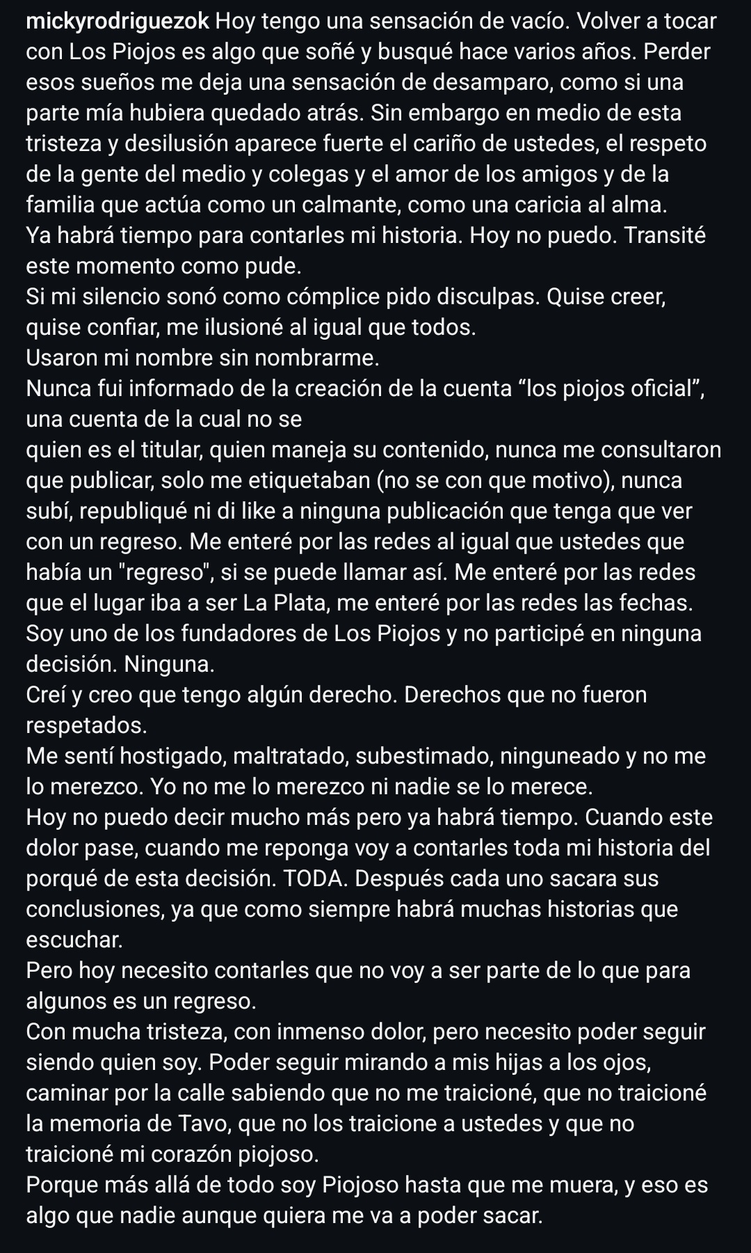 «Pero hoy necesito contarles que no voy a ser parte de lo que para algunos es un regreso. Con mucha tristeza, con inmenso dolor, pero necesito poder seguir siendo quién soy. Poder seguir mirando a mis hijas a los ojos, caminar por la calle sabiendo que no me traicioné, que no traicioné la memoria de Tavo (Kupinski, muerto en 2011), que no los traicioné a ustedes y que no traicioné mi corazón piojoso. Porque más allá de todo soy Piojoso hasta que me muera, y eso es algo que nadie aunque quiera me va a poder sacar», cerró el músico en su descargo.