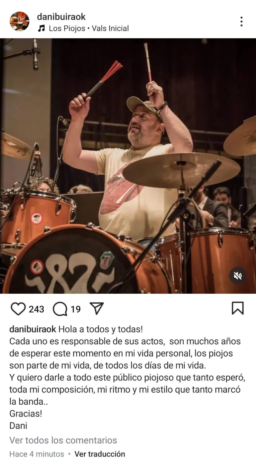 Por otra parte, el percusionista Dani Buira realizó un posteo en Instagram en el que afirma que «cada uno es responsable de sus actos».