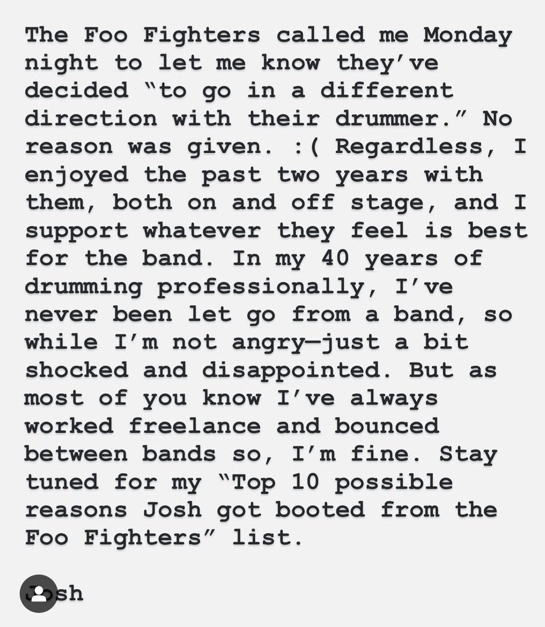Freese terminó su declaración con un toque de humor: «Estén atentos a mi lista de las 10 posibles razones por las que Josh fue expulsado de Foo Fighters».