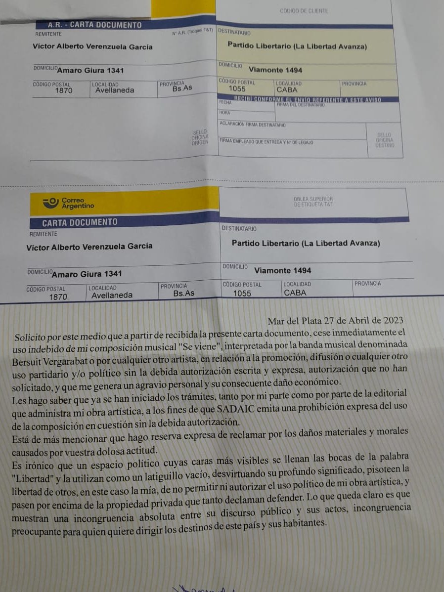 La carta documento fue enviada al destinatario Partido Libertario (La Libertad Avanza) y en su contenido tiene fuertes críticas al espacio político liderado por Milei. El candidato adoptó la canción de Bersuit en las pasadas elecciones legislativas de 2021 y desde allí en reiteradas ocasiones durante sus actos de campaña.