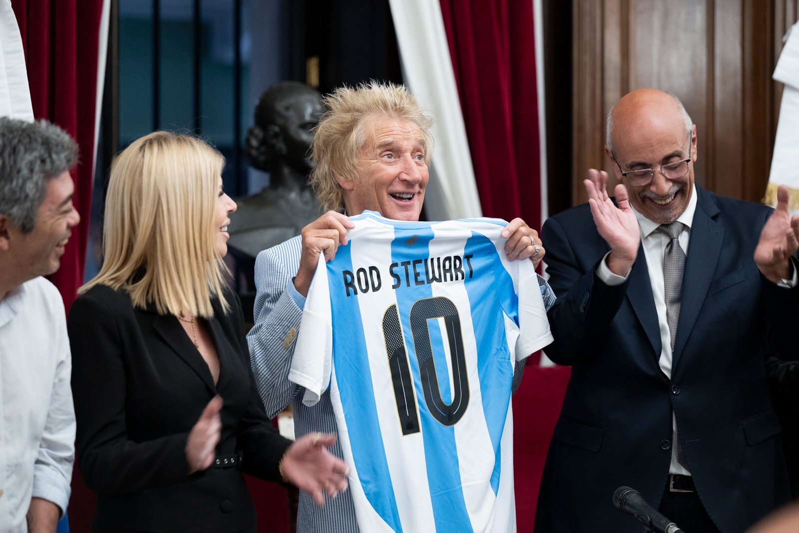 A sus 80 años, Stewart irrumpió en la ceremonia con la energía de un veinteañero. Al ingresar al salón, ante unas 60 personas –en su mayoría políticos ávidos de selfies–, soltó un grito y tarareó un verso improvisado, desatando risas y aplausos. Detrás de él, tres banderas flameaban: la argentina, la de la Ciudad y la escocesa, un guiño a sus ancestros. Recibió el pergamino con una camiseta de la Selección Nacional con el número 10 a su nombre –un detalle futbolero que no pasó desapercibido–, y no dudó en agradecer con su acento cockney teñido de emoción: «Nunca recibí una distinción de este tipo. Es un gran honor. Buenos Aires es una ciudad muy emotiva, y sus fans son abrumadores y fantásticos. Me siento como en casa». Para rematar, agregó un toque picante: «Es un placer estar en el país que le dio al mundo a Messi y Maradona».