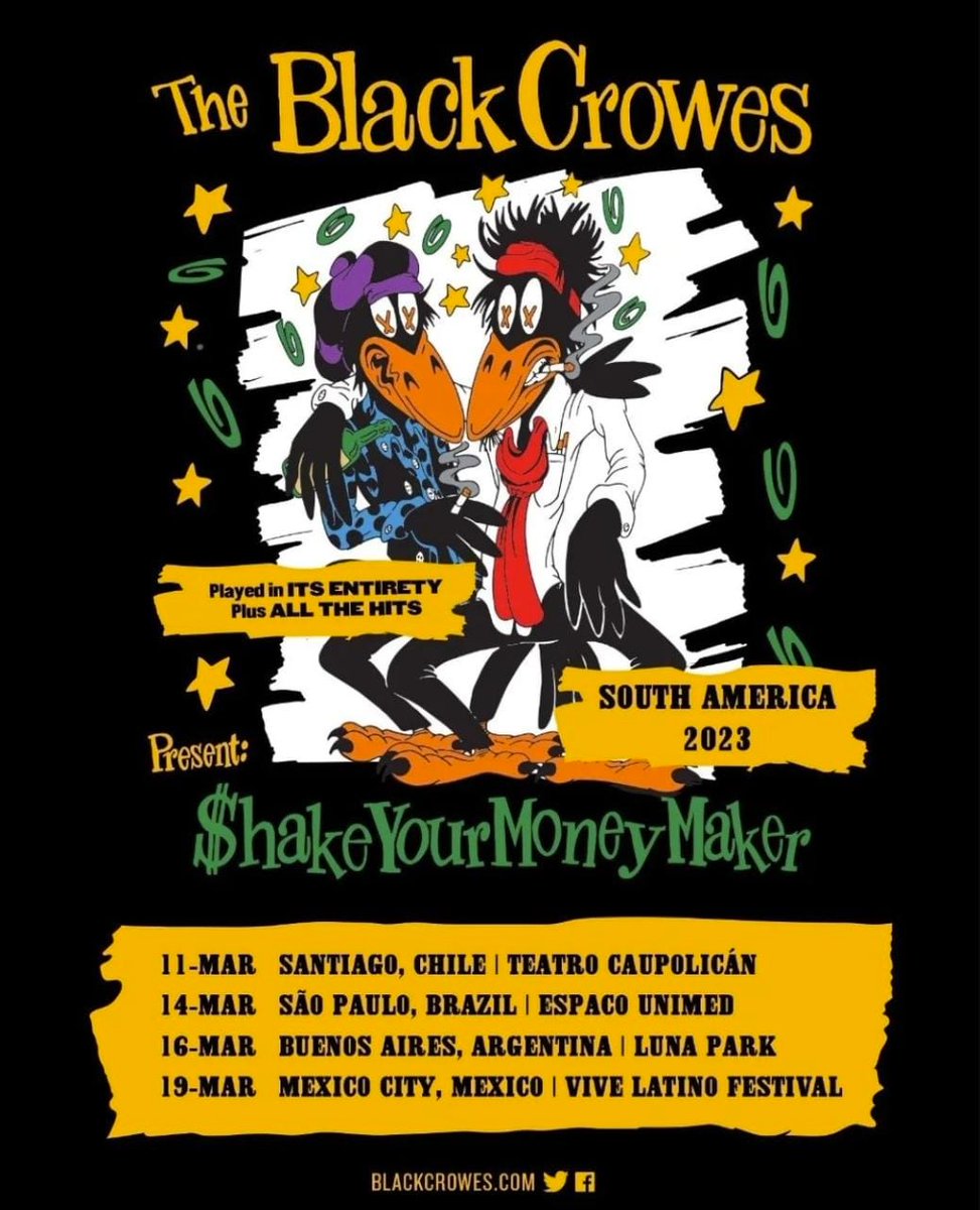 La banda estadounidense The Black Crowes volverá a la Argentina para presentarse el próximo 16 de marzo en el Luna Park, en donde repasará en su totalidad su disco debut de 1990 «Shake Your Money Maker».