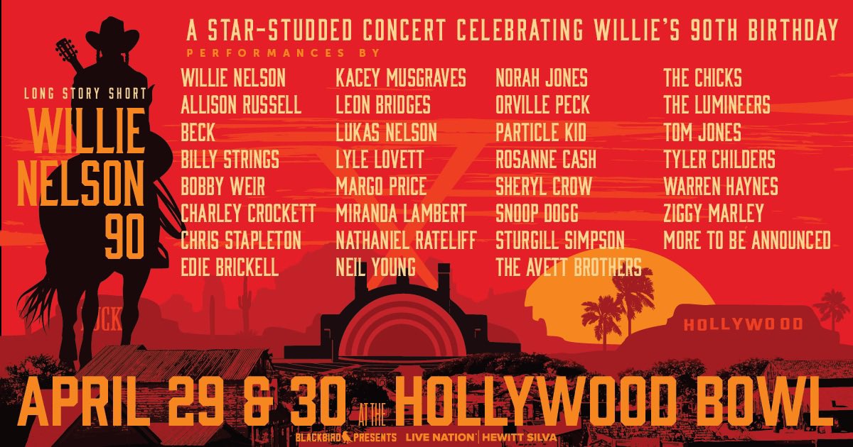 Neil Young, Tom Jones, Snoop Dogg, Beck, Sheryl Crow, Kacey Musgraves y The Chicks se cuentan entre los nombres que actuarán en «Long Story Short: Willie Nelson 90, A Star-Studded Concert Celebrating Willie’s 90th Birthday», que tendrá lugar en el Hollywood Bowl los días 29 y 30 de abril.